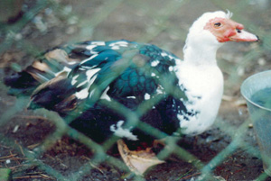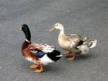 一見、カモ風の模様のつがいである。でも尾羽のカールはどう見てもアヒル。そこで、いろいろ調べてみるとアヒルの世界はものすごく奥が深いことがわかった。ひとまとめにアヒルというがもともとはマガモなどを家禽化したのがアヒル。世界中で飼われだし同時代に地区ごとに品種改良が行われた。そのため、多種多様な品種が世界中にたくさんある。さまざまな色、模様のアヒルが世界中にいる。アヒルというと白というイメージがつよいが、アオクビアヒルといわれる系統もあり。これは、かなり原種のマガモに模様が似ている。さらには、アイガモのように人工的につくられたアヒルとカモの交雑種や自然にカルガモや他のカモと交雑したものもある。それらの姿を見ると本当に面白い模様のものがたくさんある。さらに最近では、バリケンと呼ばれる中南米原産のガンカモ類の家禽もめぐりめぐって日本でも見られるようになったそうだ。台湾アヒルともいわれるが、これは原種からいうとアヒルとは別系統。顔が赤いマスクをしているような模様なのでわかりやすい。バリケンはほとんど飛べないといわれているが、普通に飛んでいたという話もあり謎の多い鳥である。もしかしたらこちらはこちらでカモと交雑しているのかもしれない。台湾ではバリケンとアヒルを交雑したものをドバンといい食肉用(成長がはやいという利点がある)に飼育しているとのことだ。とにかく、交雑、雑種だらけという感じである。さすがにドバンには繁殖力はないようである。