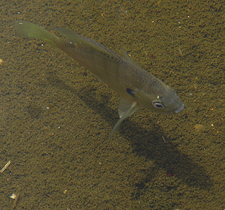 ブルーギル(Lepomis macrochirus RAFINWSQUE)はスズキ目スズキ亜目バス科の魚だ。体側に10本ほどの横縞があり、タイのような形をしている。鰓蓋の一部が後方に飛び出し、黒っぽくなっているのが特徴的だ。この魚が日本に移入された時期は珍しくはっきりとしているようで、1960年と言われている。はじめは養殖用に移入されたとのことだ。一説には渡米した当時の皇太子が土産に貰ってきたという話もある。また、はじめに移入されたのは伊豆の一碧湖と言われる。意外と氏素性がはっきりとしている。とにかく、最初はその食用としての有用性に着目されたようだ。最大、30cmくらいになるようで、実際に採集したもので最大のものは20cm以上あった。しかし、日本では環境のせいか20cmになるものは希とのことだ。また、皮に臭みがあるため、食用としては広がることはなかった。一方で、釣マニア(というよりバス・マニア)によって、ブラックバスとともに放流されたこともあるようだ。ブラックバスの餌として考えられたようだ。しかし、ブルーギルは雑食性で稚魚や魚卵も好む傾向があり、逆にバスの繁殖を抑制してしまうこともあったようだ。