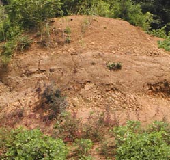 台地の部分と低地の部分では踏みしめている大地の歴史、でき方は違う。 台地では、まず、大きな特徴として関東ローム層(写真)と呼ばれる層がある。関東ロームというと赤土が有名だ。よく、耳にすると思う。台地で少し地面を掘り下げると、本当に赤茶っぽい鮮やかな色をした層が広がっている。これをローム土という。このローム土は保水力が強く、天然のダムのはたらきがあるということを聞いたことがある。実はこのローム土の下には凝灰質粘土の層もあり、ローム土とこの凝灰質粘土層をまとめて関東ローム層という。その下には成田層と呼ばれる地層が広がっている。成田層は上から(堆積した年代の新しいものから)木下(きおろし)層、上岩橋層、清川層といわれる地層から成り立っている。