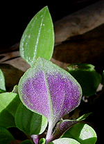 blossfeldiana)と思われる植物。観葉植物として認知されているものだそうだ。特徴は表面が緑色、裏面が紫の葉、紫色を帯びた茎、葉裏に銀白色の細毛があること。本来は直立性だが、光が弱い場所では匍匐するそうだ。写真のものは戸神川の近くに最近、開通した高架の自動車道下のトンネル内にあったもの。光は十分とはいえない場所だ。そのため、若干、匍匐状態にあるようなこともこの種の特徴に合致する。葉などの特徴も当てはまるような気がするが・・・という程度の自信しかない。
