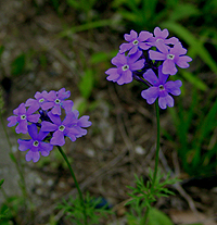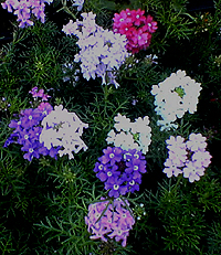 次はバーベナ(Verbena hybrids)のなかまのバーベナ・タピアン(クマツヅラ科バーベナ(クマツヅラ)属 )と思われるもの。タピアンはサントリーによって新たに開発された品種のようで、他のバーベナにくらべ葉が細いのが特徴の植物。クリーピング・タイプ(匍匐性)のものと立ち性のものがあるそうだ。戸神川近くの農道に2株、ぽつんと咲いていた。サントリーといえば園芸種の開発では今、破竹の勢いだ。大学時代、同じサークルだった者がサントリーに就職して、花をつくっていると聞いたときは「?」だったが・・・。右の写真は園芸店で売っていたバーベナ・タピアン。