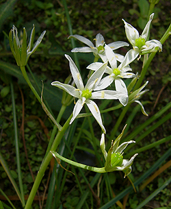 まず、はじめにオオアマナ(Ornithogalum umbellatum)。一見して、ユリ科でアマナのなかまだということがわかる植物。ただ、アマナよりぐっと大柄で、花の白色も鮮やかな感じがする。この植物はヨーロッパ、アフリカ、西アジアが原産で、明治の末ごろ帰化した。そのため、広く分布しているようで、林床などを好み繁茂するようだ。花は3月から初夏にかけて見られる。写真のものは建物の影に咲いていたもの。