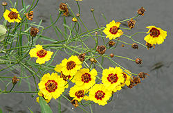 これも、園芸種として栽培されるハルシャギクというキクのなかまだ。ジャノメギクとも呼ばれる。北アメリカ原産の一年草だ。葉は対生で深裂し、ほぼ線形に見える。頭花は長い柄の先につく。舌状花は濃い目の黄色で頭花の中心よりはなんとも表現のしようがない色(濃い赤茶色、紫褐色?)をしている。全国で野生化しているようだ。写真のものは戸神川の岸から水面の上に張り出して生えていた。群生はしておらず、単独で生えていた。