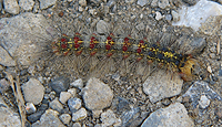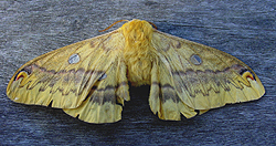 ウスタビガは成虫より繭の方が有名かもしれない。まるで、サメの卵鞘のような緑色の繭はいろいろなところで紹介されている。しかし、成虫も繭に劣らず個性的である。ウスタビガはヤママユガ科のガ。ヤママユガ科のガは大型で翅の真ん中に丸い班がある種が多い。写真のものはメスの個体だ。からだ全体が毛で覆われていて、毛あしのながい絨毯のようである。翅は黄色で、黒いすじ模様が目立つ。前翅の長さは50mmほどになる。