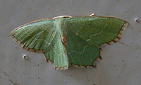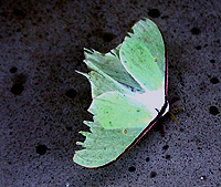 同じく、大型のガの代表選手がオオミズアオ。これも、ヤママユガ科。翅の色が美しいガだ。形も最新鋭の飛行機のような均整のとれたスタイルをしている。写真のものは、だいぶ翅が傷んでいる状態だ。民家の灯火にもくるので、よく目にするガだと思う。