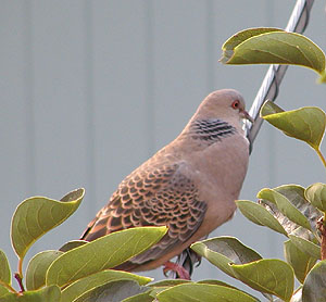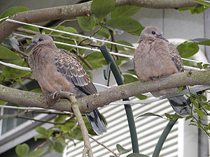 写真は巣立ちして間もないキジバトの兄弟?だ(写真下)。まだ、じっとカキの木にとまっている。近くに親が心配そうにいることもある。給餌もまだ行っている。キジバトは背側の茶色っぽい網目模様が目立つ。首の青い色も美しい。ドバトの固体ごと千差万別な体色に比べ、野生らしい統一感と美しさが感じられる体色をしている。平地、山林に生息し、昔から市街地にも見られた。が、「今は市街地で見られる」と言ってよいほど、街中で多く見られる。急速に、都市に適応したハトだ。「デッデッポッポー」と特徴のある鳴き方をする。野生のまま、徐々に都市の生活に適応してきたハトだと言える。