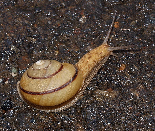 これはヒダリマキマイマイ。天気の悪い日に利根川の岸部、防災用の船着場のコンクリート上にいたものだ。殻の巻き方が他のものと異なるためこの名前が付いた。写真のように中心部から反時計回りに殻が巻いていき開口部となる。亜種にはチャイロヒダリマキマイマイ、ヘグラマイマイがいる。他のカタツムリはヒダリマキマイマイとは殻の巻き方が逆で中心から右に時計の針の進行方向に巻いていき開口部となる。