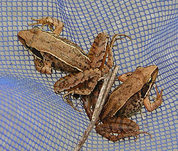 体長10〜20cmほどの大型のカエル。緑褐色に不規則な暗褐色の斑紋がある。北アメリカ原産。食用とされるため食用ガエルともよばれる。鳴き声が牛に似ている。