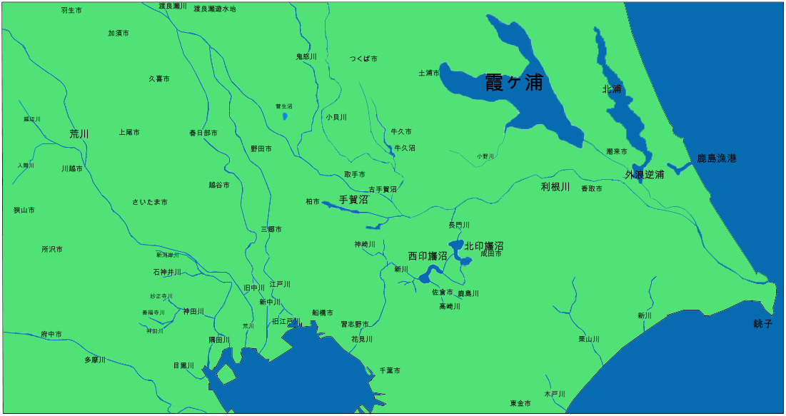 水系だ。今の利根川の流れはかつて(近世以前)、常陸川と呼ばれた流れであったようだ。利根川自体は本来は東京湾にそそぐ河川であった。