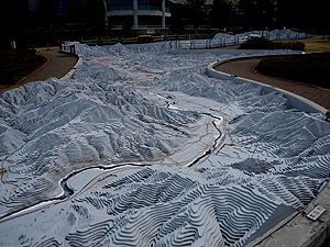 その川の博物館では屋外に荒川の源流点から河口までの大規模な立体模型(下右写真)がある。荒川の流域全体を確認できるが、大きすぎて河