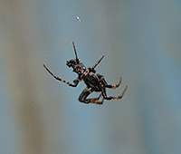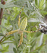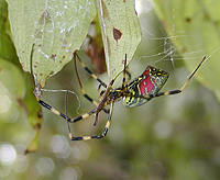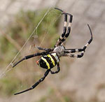 前述のように夏であればちょっと歩くだけで次々といろいろな種類のクモを発見できる。いちいち、種を調べていたら、いらいらがこうじるだけというくらいの種類のクモがいるが、今回は割合、身近で目立つクモをいくつか紹介する。