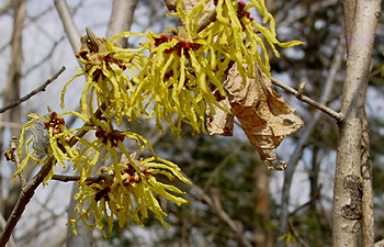 しばらくいくと、今度は正しくマンサクがあった(下写真)。マンサクのなかまにはマンサク、マルバマンサクやシナマンサクなどがある。マンサクは8mくらいまで育つマンサク科の落葉小高木。葉は互生で、倒卵形、歯牙がある。本州の太平洋側、四国、九州に分布する。マルバマンサクは名前の通り葉が丸く日本海側に分布する。シナマンサクは中国から移入され、庭木などに使われる。特にシナマンサクはマンサクと区別しにくい。全体に大柄で、花の時期にかなり多くの枯葉が残っていることが多いようである。また、花期もマンサクの3月、4月に比べ、1月ころから咲き始めるようだ。さらに、園芸種としてさまざまなものがあるようだ。花の丘のマンサクは枯葉が少ない(ほとんどない)ことと、花期から考えて「マンサク」だと思われる。