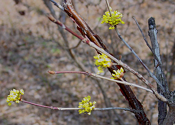 3月はじめに花の丘公園を歩いていると落葉した枝にいくつもの黄色い球状のものがあるのに気づいた。よく見ると花が集まっている。さらに、よく見ると、それらは小さな黄色い花だ(上写真)。 この時期に咲く黄色い花といえばマンサクがすぐに思いつく。マンサクは葉がつく前に黄色い花を咲かせる木だ。花は黄色い線状の花弁が4枚つき、花弁はちじれていて独特の花の形となる。そのちじれた花弁はどことなくアメリカン・コミックにでも出てきそうなキャラクターの頭髪を思わせる。しかし、これは、少し様子が違う。マンサクよりはるかに小さな花がたくさん集まっている。サンシュユのようだ。サンシュユはミズキ科の樹木だ。もともとは中国、韓国の植物で薬用として江戸時代に寺などに植えられたのがはじめのようだ。樹高は4-5mほどになる。樹皮が剥がれ落ちる性質があり、枝は紫褐色をしている。花の丘にはかなりの数が植えられている。枝の所々に黄色い玉がついているようで、なかなか美しい。