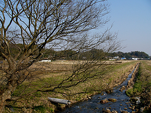 平成15年12月31日、大晦日、久々に子の橋にいってきた。ちょっと見ると、冬の子の橋周辺は一面、枯草色だ。川岸の植物、背の高いヨシ、セイタカアワダチソウ、水田の植物、すべてが枯れ草に見え、同色でつながっているように感じる。橋の付け根のエノキも落葉し枝、幹の濃い色だけになっている。緑は遠くに雑木林、民家の庭木の緑だけが目立つ。それでも、よく見てみると少しずつ、植物たちが春の用意をしていて、薄い緑の絨毯が広がっているところもある。自然は、冬には春が、春には夏が隠れている。ところで、せっかくの景色なのに、橋の付け根に解体業者の立看板が立ち、興ざめであったが、いつの間にかなくなった。