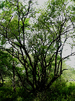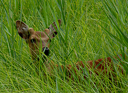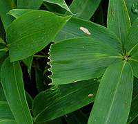 赤沼で車を止め、戦場ヶ原の遊歩道に入る。はじめはバラ科のズミ(写真左)の涼しげな林を川にそって進む。しばらく行くと分岐がある。湯滝方面と小田代原方面にそれぞれ進むこととなる。今回は小田代原に向け、歩を進めた。しばらくは、ササ(ミヤコザサ)が地面を覆うミズナラを中心とした落葉樹の林の中を進むこととなる。このとき、ササの葉をよく見ると右写真のように葉の先がないものがある。これはシカに食われたあとだ。シカは葉の柔らかい部分だけ食べる。