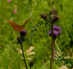 ニッコウアザミの花にはヒョウモンチョウのなかま、(多分、ミドリヒョウモンだと思う。ミドリヒョウモンはアザミの類を好むし)がとまって吸蜜をしていた。