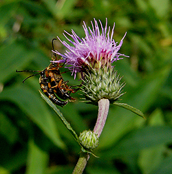 アザミの花にはいろいろな昆虫がやってくる。ヨツスジハナカミキリもアザミの花で見ることができた。