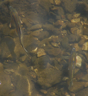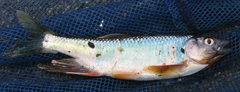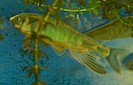 オイカワZacco platypus はコイ目コイ科の魚で、瀬、特に平瀬を好むようだカワムツやヌマムツにも似ているし、一部では交雑もしているようである。オイカワとカワムツは瀬と淀みで棲み分けがあることは有名だ。似たなかまの中で、婚姻色はオイカワが一番美しいように思える。姿もオスの広い鰭は見栄えがする。しかし、魚は上から見ると保護色となっていて、黒っぽく見えるだけで美しくない。オイカワも上から見ると上の写真のようにしか見えない。だが、横から見ると一変する。水槽で見るとそれぞれの魚が様々な姿を見せてくれる。オイカワも横から見てこそ美しい。しかし、この時期のオイカワの雄は川を斜めから見ているだけどもその美しさはわかる。