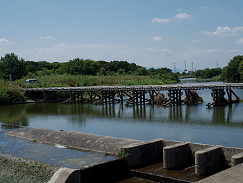その越辺川に数十年ぶりに行ってみた。小学生のころほどの感覚ではないが川幅もけっこうある川だ。そして、人工物は都心近郊の川としては少ない。自然な感じの岸辺も残っている。今回、川に近づいたのは、堰が設けられ、近くに木造の橋(八幡橋)がある場所だ。この橋は欄干がなく、冠水橋(潜水橋、沈水橋ともいわれる)で、増水時には水没する橋だ。今、越辺川にはこのような橋が残っているそうだ。堰の下流には凹凸の構造物が川底に設けられている。さらにその下流には自然に近い状態の岸部が続いている。