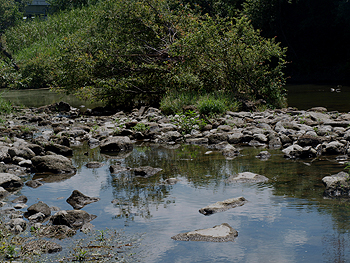 とにかく、魚が多い。岸のすぐ脇から、離れたところまで、様々なサイズの魚群が戯れている。岸辺の群れは岸にこちらが近づくと流石に逃げるが、しばらくするとまた、集まってくる。堰がつくられているので水深が浅い平坦部がある。そこを、水面にすじを残しながら魚が勢いよく泳いでいく。今回は時間がないことと、訪ねた時間が昼過ぎであった(ちょうど暑い時間)こともあって長居をせずに帰ってきたが、ゆっくりとあらためて行ってみたいと思わせてくれる川であった。