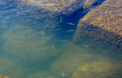 堰があるためであろうか、水中をのぞくと多くの魚が群れている。捕獲していないので、よくわからないが、堰の下流の凹凸部で群れているのはハヤ類であろう、かなりの数である。このハヤの類より数は少ないがオイカワもけっこういる。ハヤやオイカワはいつもの通り、流れに逆らい上流に向かい戯れている。そして、流れに関係なく勝手気ままに泳いでいるのがブラックバスだ。ただし、まだ若魚で、全長でも10cm程度だ。ハヤと思われる魚は数センチの群れから10cm超えのものまで様々だ。