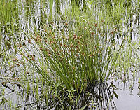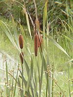 左からチガヤ、ガマ、イヌホタルイ。チガヤはこのあたりでは多いイネ科の植物で、葉の縁がざらつく。水が多いこのあたりではガマ科ガマもよく目にする植物だ。夏季、湿地化した休耕田に生えていたカヤツリグサ科のイヌホタルイ。