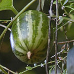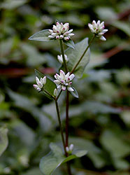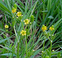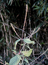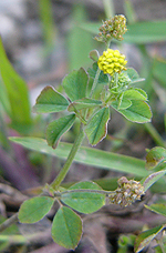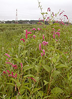 カラスウリの熟した実と若い実、キツネノマゴ、ミゾソバ、コモチマンネングサ。カラスウリはウリ科の植物で秋に赤く熟す実が特徴的だが、若い実は写真のようにスイカのような模様をしていりる。キツネノマゴはキツネノマゴ科の植物。キツネの尾のような花穂が特徴的。ミゾソバはタデ科、葉の基部が耳状になる特徴がある。よく似たものにママコノシリヌグイがあるが、ママコノシリヌグイは茎に強固なとげがある。ベンケイソウ科のツルマンネングサは畦にあった植物。黄色い小さな花が集まっているのはマメ科のコメツブウマゴヤシ。