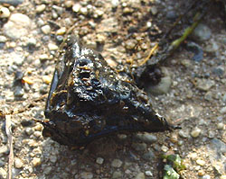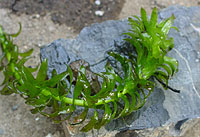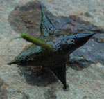 左からヒシの葉と実、オニビシの実、オオカナダモ。ヒシはヒシ科の植物で実にあるとげが特徴。オニビシのとげは4本だ。戸神の調整池ではオニビシが繁茂している。戸神川ではヒシが多い。水勢がある程度影響するのかもしれない。オオカナダモはトチカガミ科の外来植物。