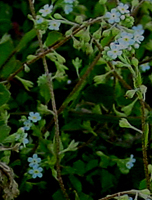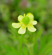左かケキツネノボタンの花と実、タガラシ、キュウリグサ、カキドオシ、ムラサキケマン。ケキツネノボタンはキンポウゲ科の植物で実の形が特徴的。茎に毛がある。キツネノボタン、ウマノアイガタも花が似るが、キツネノボタンは茎に毛がなく、実のとげの先が曲がる傾向にある。ウマノアシガタの上部の葉は披針形で細身。次は同じくキンポウゲ科のタガラシ。ケキツネノボタンより小型。湿った場所を好む。実がカプセルのような形をしている。どちらも水田の近くに多い。キュウリグサはムラサキ科の植物で青い直径が2mmほどの小さな花をつける。カキドオシは紫色の花をつけるシソ科の植物。畦、林縁などで見つけられた。ムラサキケマンはケシ科の植物。