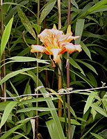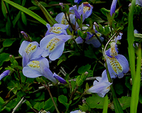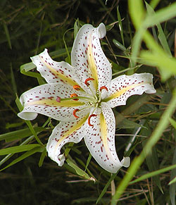 左からノハラナデシコ、キキョウソウ、ヤマユリ、ヤブカンゾウ、オトコエシ。ノハラナデシコはナデシコ科の植物で、わりあい開けた場所で見られる。花は小さいが美しい姿だ。名前の通り、キキョウ科の植物でこれも開けた場所で見られる傾向にある。小型のキキョウらしい花をつける植物。ヤマユリはユリを代表するような大柄なユリで林縁などで見られる。道のわきの斜面に数株咲いていた。観賞用に用いられ、乱獲されることもある。ヤブカンゾウもユリ科の植物。オトコエシはオミナエシ科の植物。林の中で見られた。