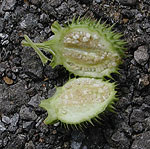 左からオオベニタデ、イヌホオズキの花と実、ヨウシュチョウセンアサガオの花と実。オオベニタデはタデ科の植物で神崎川沿いに咲いていた。イヌホオズキも同じく神崎川で見られたナス科の植物。実が写真のように黒く熟す。次もナス科の植物のヨウシュチョウセンアサガオ。葉の鋸歯、実のとげが目立つ植物だ。全体がとげとげしている。