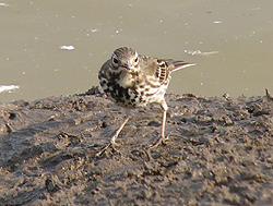 このあたりのタヒバリ類は茶色を中心として色合いがぐっと地味なものが多い。タヒバリ、ビンズイのどちらも茶色っぽい背に、白色の腹部、その腹部に黒斑が目立つ鳥だ。