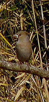 シメがこのあたりで見られるのは冬だ。北海道で繁殖して、冬季にやってくる。落葉樹の林に飛来し、種子を中心に食べる。写真のものは花の丘公園で散策中にみつけたもの。前方を黒、白とやや赤みを帯びた褐色が目立つ鳥が通過して、池にはり出した木の枝にとまった。双眼鏡で見てみると嘴が太く、大きめだ。体色は頬から首にかけてグレー、のど元、嘴の付根が黒色だ。確かにずんぐりとした感じがする。ただ、太っているとまでは言えないような気もするが。飛翔中に目立つ白色は初列風切基部と大雨覆の白色のためだ。種子を中心に食べるためか、嘴は大きめで頑丈そうだ。上嘴のほうがちょっとでっぱって見えるようなときがある。写真の固体はメスのようで、あまり、目立つ体色ではない。腹は赤っぽい茶褐色、独特の色合いだ。アトリ科の鳥で、やはり、同じなかまのイカルと似ている。イカルとは体色の違い、嘴の色(イカルは黄色、シメは淡灰褐色と図鑑では記載してあるが、やや、肌色気味にも見える)、尾の長さ(イカルのほうが長く、先端中央部が凹んでいる)などで区別できる。飛び方は波状だ。