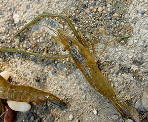 テナガエビはかなり活発なエビ。夜行性ではあるが昼間もかなり活発に活動しているようで、罠を仕掛けておくとほとんどの場合、このエビが入ってくることが多い。もちろん、不必要な場合はそのまま、放流する。数も減少傾向にあるとのことである。しかし、このエビが減少したのは農薬の影響が強いようで、近年は一部地域では増加しているところもあるそうである。印旛沼水系では多くの川でかなりの数が生息しているようだ。かわえびの唐揚などといわれ、料理される場合が多い。前の1対の胸脚が非常に長いため、テナガエビの名前がある。この胸脚はメスよりオスのほうが長い。大きさは10cmほどまで成長する。体長は10cmほどでも長い胸脚は体長の1.5倍ほどにもなる。川にふつうにいるので知らなかったのだが、河口付近で過ごし幼生が海ですごすものと、淡水で育つ陸封型があるそうである。テナガエビ科、テナガエビ属に属する。夏に産卵されメスの腹部遊泳脚のあたりに付着する。幼生を経て1ヶ月ほどで成体になる。このため十脚目の抱卵亜目に属する。つまり、十脚目、抱卵亜目、テナガエビ科、テナガエビ属、テナガエビとなる。食性は動物質を中心とした雑食性。底生のプランクトンや他の生物の遺骸を食べているようだ。飼育については、ちょっとという感じである。何気なく飼っても長生きするもの(場合)もあるが、わりあい早く死んでしまうもの(場合)もある。印旛沼水系でエビのなかまとしてこの他に多くいるのがヌカエビだが、かなり小型のエビだ。それに比べ色は地味だが、大きさと長い胸脚があるテナガエビは見応えのあるエビである。テナガエビは、前述のように印旛沼水系では身近なエビだ。