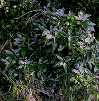 右はアオキ。ふ入りの園芸種が野生化したのや、ふのないもの。鋸歯のものと、全縁のものなどがあるようだが、葉がおおぶりであることと独特のつやがあることで区別しやすい。