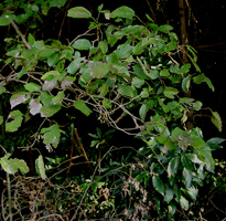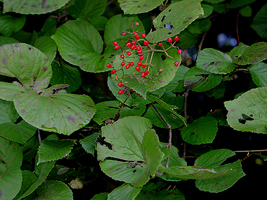 ガマズミ(スイカズラ科)のなかまも多い。種の同定は難しい。写真右はガマズミであろうと思われる。葉が丸く、葉柄が短い。左もガマズミのなかまだが、葉柄も長く、葉が細長いものである。はっきりとした種はわからない。