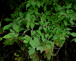 左はムラサキシキブ。紫色の小さなきれいな実がつくので、実の時期には区別しやすい。なかまにコムラサキがあるが、葉がコムラサキは細長いので区別できる。
