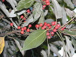 これはシロダモ。クスノキ科の樹木だ。葉の3支脈が目立つクスノキ科の植物。小高木で、雌雄異株。花期(10-11月)に全年の実が赤く熟す。ということで、写真の株は雌株で、実は昨年できたということになる。種子からは油がとれ「つづ油」と呼ばれ,ろうそくの原料として使われていたそうだ。