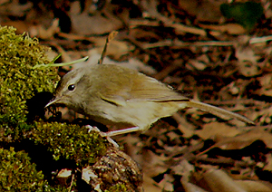 春の代名詞、ウグイス。ウグイスは「ウグイス」と表記するより「鶯」、「うぐいす」と表記するほうが似合うほど日本人には馴染み深い鳥だ。ウグイスの「ほーほけきょ」という鳴き声もよく知られている。この声が有名であるのはその特徴的な鳴き方のみでなく実際によく聞かれることにも由来しているようだ。昔は「うぐいす笛」などという笛がよく観光地で売られていた覚えがある。ウグイスの声は山野だけでなく、都心でもよく聞かれる。一方、「鴬色」というようにその体色が色の名前にまでなっているのに姿はあまり見かけない。これはウグイスが藪を好むことによる。林内で昆虫などを食べるが植物の種子や果実なども食べることがあるようだ。同じウグイス科に属は違うがムシクイのなかまがいる。姿も似ている。体色は上面、背面が暗い灰緑色で下部ややや白っぽい。上面も「鶯色」のようにきれいではないような気がするが....実は鶯色はウグイスのこの色、つい派手なメジロの色を想像してしまう。白色の眉斑、黒褐色の通眼線が目立つ。ときどきメジロをウグイスと間違える人がいる。メジロは緑色がウグイスにくらべ明るく鮮やかだ。眼のまわりの白い模様も目立つ。メジロはウグイスと違い人家の庭にもよく来る。また、ウグイスはメジロと異なり意外と尾が長い。雌雄で体色の違いはない。