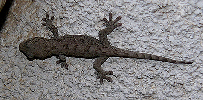人家で見られる爬虫類のヤモリだ。正確にはニホンヤモリ。トカゲの近い体形をしているが、肢指が幅広く見える。また、目が大きく顔は可愛らしい。夕方になると人家の窓や戸によく貼り付いている。決まった時刻に、決まった場所に現れることがよくある。ヤモリの肢の指の裏を見るとまるで、運動靴のように横方向に何本も溝が入っている。このような構造を指下板といい、さらに、毛が生えている。このつくりによって壁やガラスにへばりつくことができる。吸盤ではないので、凹凸が全くないつるつるのガラスには貼り付くことはできない。昆虫食で、小さな虫たちを捕まえて食べる。