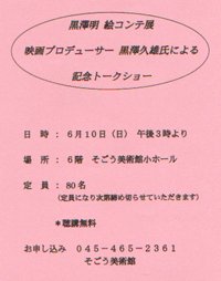 世界の巨匠・黒澤明が、生前に脚本と絵コンテを完成させ、制作寸前にまでこぎ つけながら断念した映画があった。 岡場所に暮らす遊女たちの、ひたむきに生 きる姿を哀感を込めて描いた《海は見ていた》本展は、この映画のために黒澤明が 残した80点におよぶ未発表の絵コンテによって、幻の映画を甦らせる試みです。 《七人の侍》 《羅生門》 《生きる》など、数々の名作映画の監督として知られる黒 澤明は、若い頃に画家を志していました。 1980年に公開された《影武者》以降、彼が本格的に取り組んだ絵コンテは、映画 撮影用のコマ割りを超越した、それ自身が鑑賞に耐える「絵画」と言ってもいいもの です。《海は見ていた》の絵コンテでも、絵の具やパステルを塗り重ねた迫力ある画 面が、黒澤映画の感動を伝えてくれます。本展ではこのほか、《乱》や《夢》などの 作品から厳選した約80点の絵コンテをあわせて展示し、「画家」としての黒澤明の 実像に迫ります。