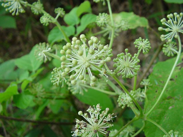里山の縁にこの花が咲いていた。 ウドの大木というけど、これは背の丈1m位の“小木”だった。 今頃花が咲くのかなあ?と図鑑を調べたら「花期は8-9月」とあり納得。 よく食べられずに生き残ったものだと妙な感嘆。小さいから助かったのかも^^。
