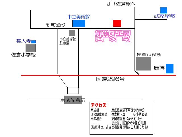 | 手づくり工房さくらでは、次のようなメニューをご用意して、みなさんをお待ちしています。 手づくり工房:@機織り実演、教室、展示 A陶芸品展示 B工芸品(彫刻、金工、竹細工)実演、教室、展示 無料お休みどころ:古きよき町屋でごゆっくりおくつろぎください。 おもてなしどころ:お抹茶&お菓子セット、お煎茶&お菓子セット、コーヒー、 カフェラテなどでおもてなし。(有料) 商いどころ:てづくり工房での作品他、ここにしかない佐倉の産品を販売します。 佐倉散策の際のお休み処として、気軽にお立ち寄りください。 |