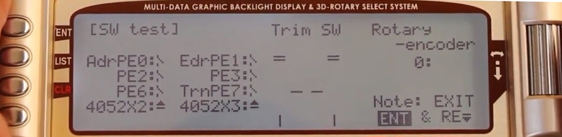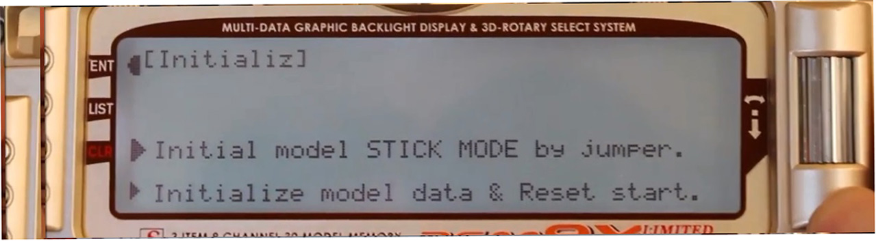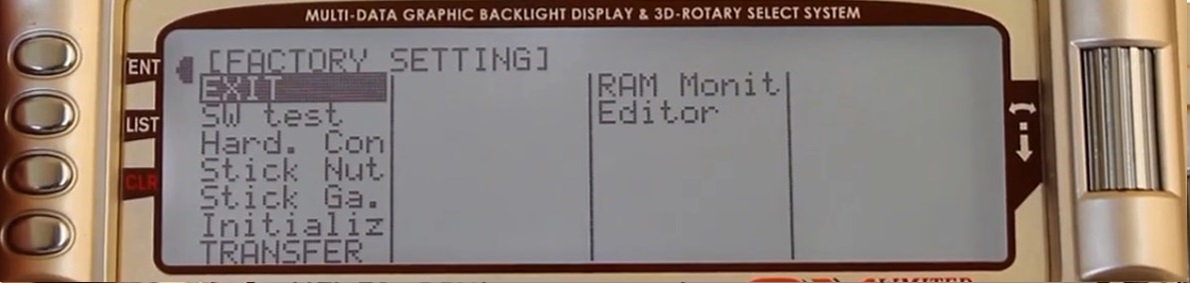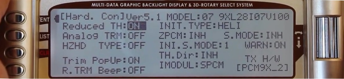 Options are selected using the roller, and may vary depending on exact version of the transmitter; changing things here could probably seriously damage your radio: Reduced TH: ON スロットルスティックの動作範囲が制限されている場合はON(ストッパーが付いているのでメカニカルに制限されています) Analog TRM: OFF DIGITAL TRIMなのでOFFです HZHD TYPE: OFF Trim Popup: ON possibly controls popup that appears when trim switches are used. R.TRM Beep: OFF INIT.TYPE: HELI デフォルト・モデル・タイプの設定、HELIが選択されています。 9Xはこれ以降の設定の変更は出来ません。ジャンパー設定が必要と思われます。 ZPCM: INH ZPCMを選択できるようにします。表示されるのは40MHZの時だけのようです S.MODE: INH "ACT"にするとシステムメニューでステック・モードを変更することができるようになります。 INI.S.MODE: 1 ステック・モードの初期設定、モード1が選択されています。 WARN: ON TH.Dir: INH スロットルのLOW/HIを逆にすることができます IMODUL: SPCM 変調の初期設定を変更できます。現在は”SPCM"です。 TX H/W: [PCM9X_2] possibly configures software for transmitter hardware version [ENT] サービス・メニューに戻ります Stick Nut (STICK NUTRAL)