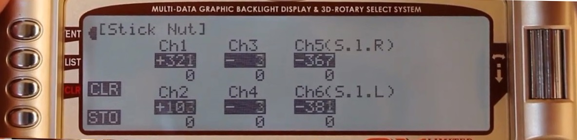スティック及びスライダーのニュートラルポジションを設定します。各チャンネルには 2 つの値が表示されます。 上の値は、ニュートラル・オフセットが適用されたスティック位置です。ニュートラル・ポジションで”0”からずれている場合は調整が必要です。 下の値はニュートラル・オフセット値です。 [ENT] サービスメニューに戻ります。 [CLR] ニュートラル・オフセット値をクリアします。 [STO] 現在のスティックとスライダーの位置をセンターのポジションとして”0”になるよう自動的にオフセット値が変更され保存されます。その後、[Stick Ga.]を設定する必要があります。 Stick Ga. (STICK GAIN)