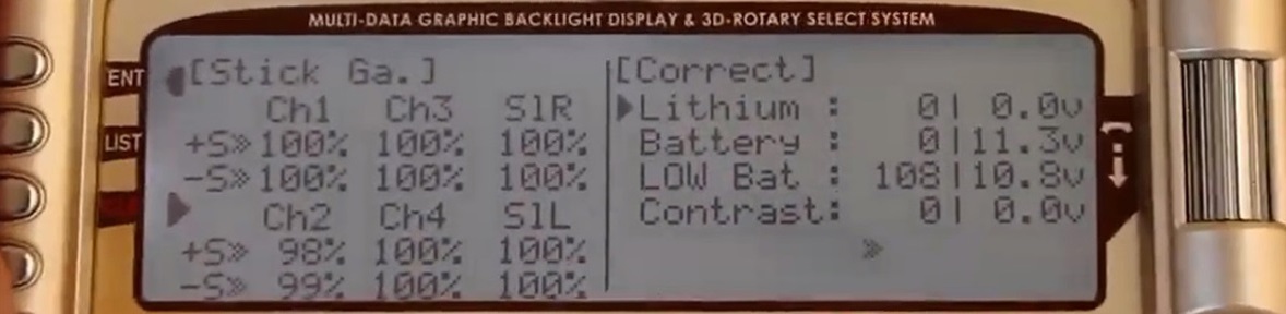 STICK GA. ジンバルとスライダーの範囲を設定します。 [ENT] サービスメニューに戻る [CLR] スティック範囲をクリアし、初期化プロセスを開始します。 すべてのステック及びスライダーの値が値が黒白の「125%」になります。 各ステック及びスライダーをフルストローク動かすと、値が黒白の「125%」から白黒の値に変わります。 スライダーを除いて、スティックが適切に中央に配置されている場合、これらの値は互いの 5% 以内になる可能性があります。 特にスロットルスティックでは、強く押しすぎないようにしてください。 CORRECT バックアップ・リチウム電池及び送信機バッテリーの電圧値の調整、バッテリ アラーム電圧の調整 (デフォルトは 9.0V)、コンロラストの初期値の調整をします。 9XⅡはリチウム電池が無いので表示は”0.0”ボルトとなっています。 Initializ