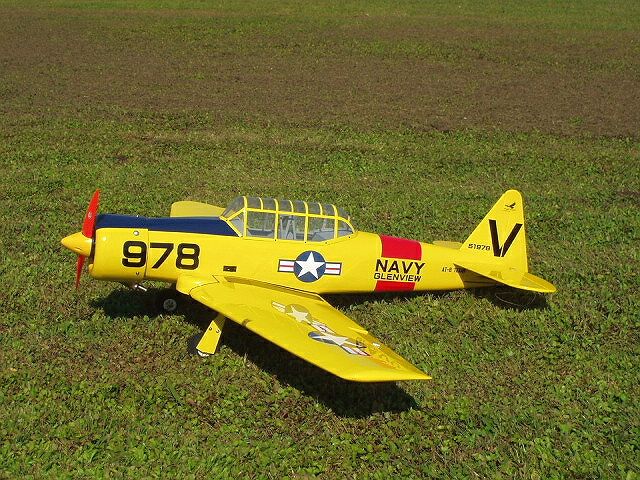 AT-6 テキサン エンジン:OS MAX32SX-H 機体重量 2.1kg メーカー:自作 翼幅 130cm ヘリ用のエンジンを搭載してマフラーも自作しています 製作:早川 昇