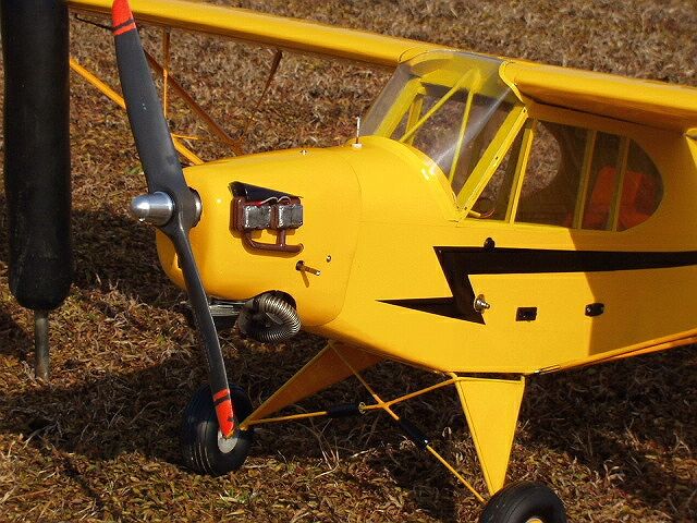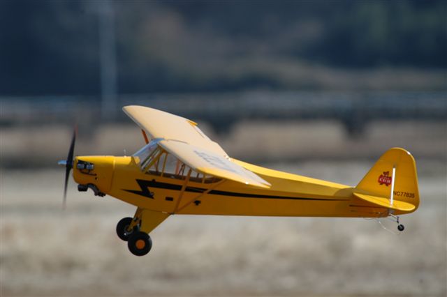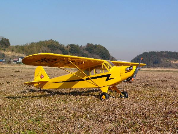 パイパーJ3カブ (撮影 2005/2/6 辻野さん提供) エンジン:OS FS52 メーカー:SIGの図面より自作 製作:早川 昇 2005年1月7日 初飛行、ギア周りの強度不足のため改修 ダミー・エンジン、ギア、主翼支柱の取付方法など色々工夫されています。 3月のスケール大会を楽しみに!!