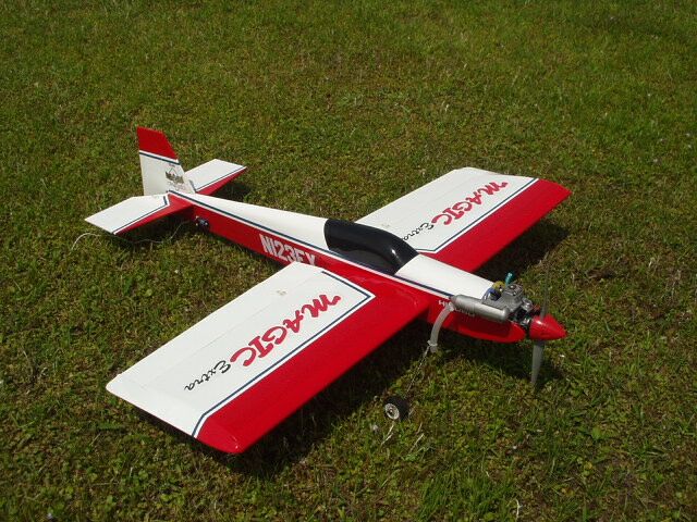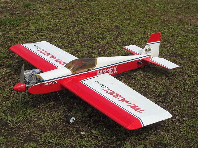 MAGIC EXTRA 20 エンジン:os15LA 機体重量 900g メーカー:ヒロボ 全幅:900mm 全長:900mm(スピンナーを含まず) 主翼面積:23.8dm2 ヒロボの完成機です、少し主翼に捩れがありトリムが必要です waypointのサーボW-150MGを4個使用して軽量化しましたが、サーボケースの強度が弱いようです。 飛行調整中です 製作:上条