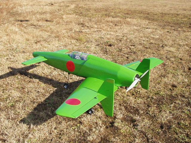 局地戦闘機 震電 ブラシレスモーター 機体重量:2900g+バッテリー重量550g(リポ6セル) 製作:宮崎 ジャパンアメニティの91クラス震電のバルサキットをもとに自作しモーター化しました。 エンジン機を考えていましたが逆ピッチぺラやバランス錘の搭載などで重たくなるので変更し ギアはとりあえず固定式にして、リポ6セルで軽量に仕上げています。 2008年12月7日初飛行に成功しましたが滑走路の状態が悪く着陸時先尾翼を損傷しました。 次回、修理後のフライトが楽しみです。 2008年12月7日撮影